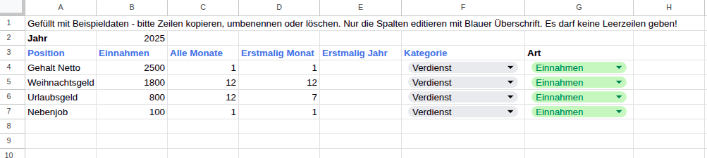Die Spalte F, Fällig 1 Jahr, ist nur dann interessant, wenn es Rechnungen gibt, die z.B. nur alle 2 oder mehr Jahr fällig werden. Dazu muss unter Alle Monate 24 für alle zwei Jahr, 36 für alle drei Jahr usw. eingetragen ist. Die Ausgabe wird im Jahr vorgemerkt, das in Spalte ‚Fällig 1 Jahr‘ angegeben ist, und im Monat, der in ‚Fällig 1 Monat‘ steht. Beispiel: Alle Monate = 36, Fällig 1 Monat = 3, Fällig 1 Jahr = 2024 bedeutet, dass die Rechnung alle 3 Jahre fällig im März wird, das erste Mal im Jahr 2024 (dann 2027).