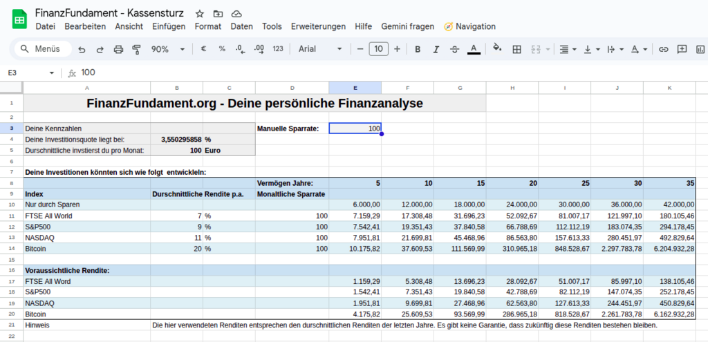 Im Tabellenblatt Tipps und Ziele siehst du, wie hoch deine Investitionsquote liegt und mit welchen möglichen Renditen du ein Vermögen nach 5, 10, 15… bis 35 Jahre aufbauen kannst, wenn du bei null anfängst.