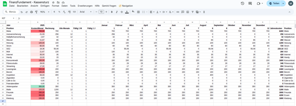 Ein von mir erstelltes Google-Sheet hilft dir, deine Finanzen zu sortieren. Das Dokument ist mit Beispieldaten gefüllt und kann an deine persönliche Ein- und Ausgabesituation angepasst werden. Hier beschreibe ich dir ausschließlich die Funktionsweise des Dokuments und wo und wie du deine Daten eingibst.