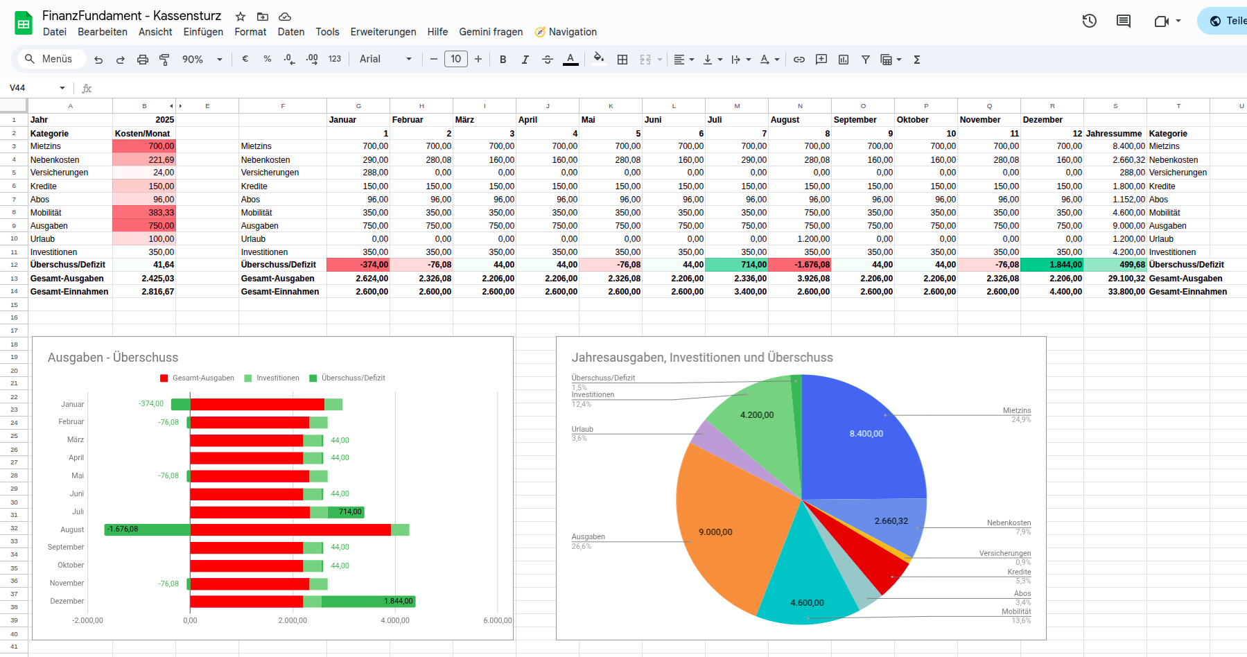 Im Tabellenblatt AUSAGG werden alle Ausgaben des Jahres pro Monat aggregiert, in der Spalte S stehen dabei Jahresausgaben pro Position. Die Farbgebung in Spalte B verdeutlicht größere Positionen.