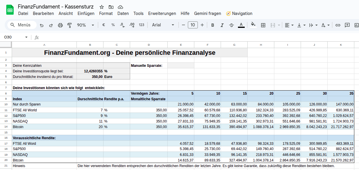 Im Tabellenblatt Tipps und Ziele siehst du, wie hoch deine Investitionsquote liegt und mit welchen möglichen Renditen du ein Vermögen nach 5, 10, 15… bis 35 Jahre aufbauen kannst, wenn du bei null anfängst.