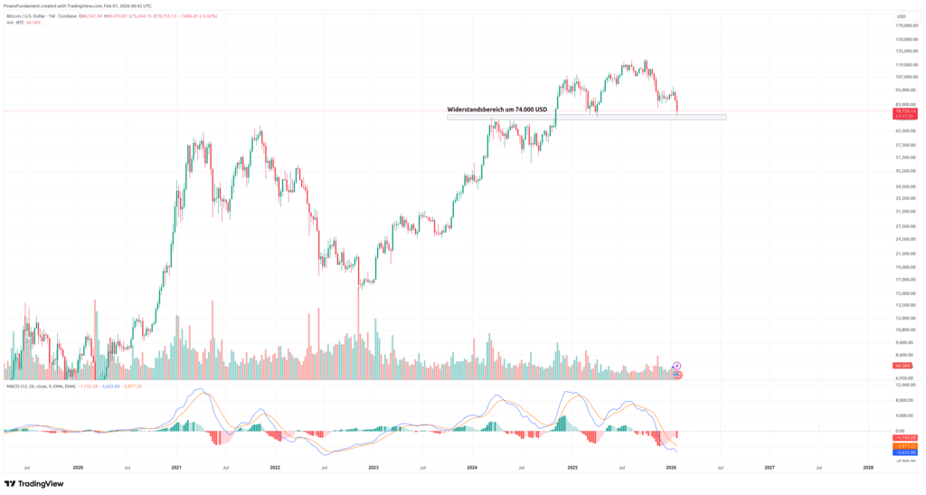 Die USD-Stärke wirkt kurzfristig belastend. Der Kurs testete erneut den Bereich um 74.000 USD, konnte ihn jedoch verteidigen. Technisch bleibt Bitcoin angeschlagen, fundamental unverändert.