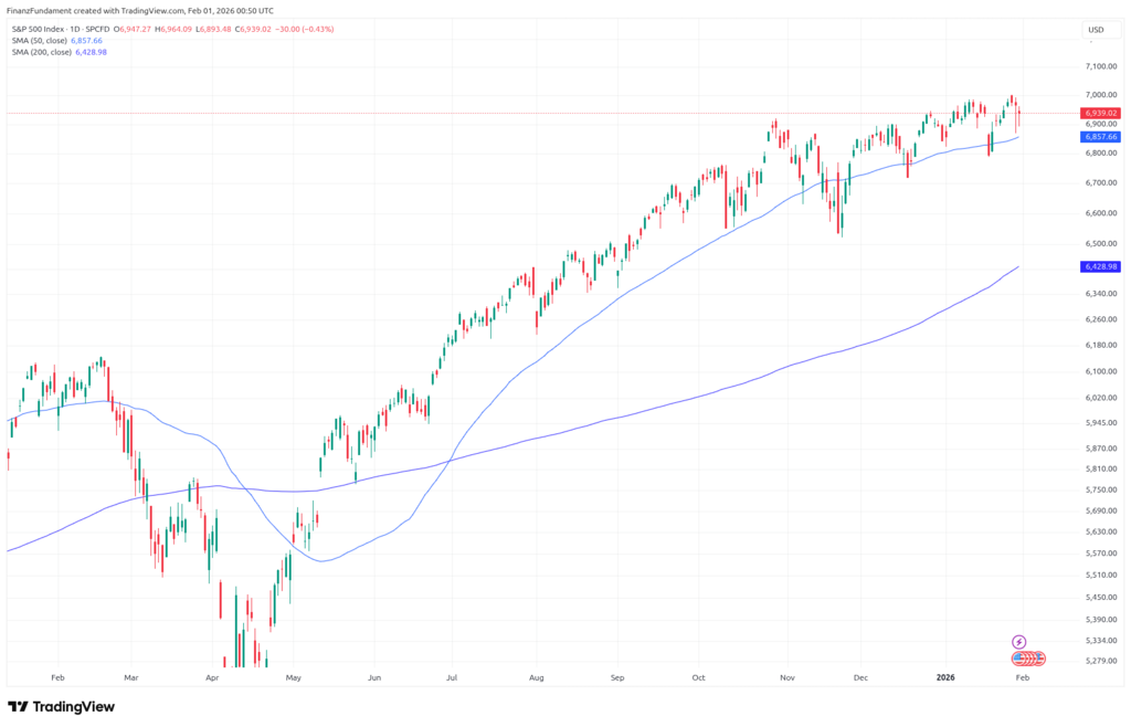 Auffällig: Der Markt hält sich über der 50-Tage-Linie, aber mit nachlassender Überzeugung. Käufer sind noch da, agieren jedoch selektiver. Markterwartung wegen Nominierung von Kevin Warsh zum neuen Fed-Chef neu ausgerichtet.