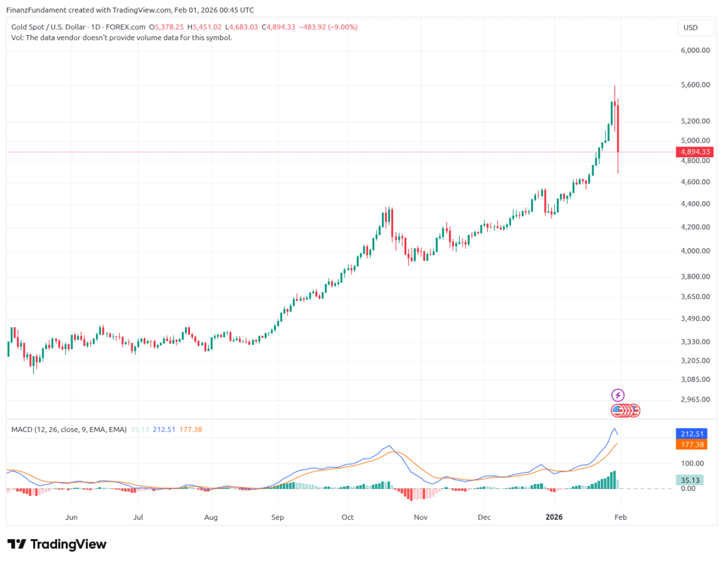 - Gold: –2,57 % (5 Tage) – klares Risk-On-Signal, am Freitag -10%
