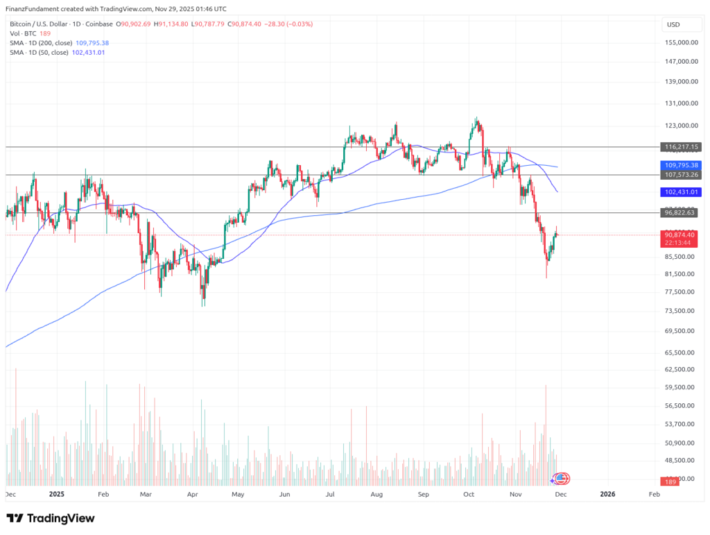 Bitcoin befindet sich im Bärenmarkt und bleibt technisch gegenüber dem Aktienmarkt zurück. Die aktuelle Erholung ist positiv, aber charttechnisch unbestätigt. Für eine echte Trendwende müssen drei Marken nachhaltig gebrochen werden: 97.000 relativ schnell, sonst droht kurzfristig der weitere Abverkauf. 107.000, um Anlauf auf 116.000 zu nehmen – eine Hürde die weiterhin überwunden werden muss, um einen erneuten Angriff auf das Allzeithoch zu nehmen. Solange diese Levels nicht fallen, bleibt Bitcoin technisch im Bärenmarkt, unabhängig von kurzfristigen Erholungen.