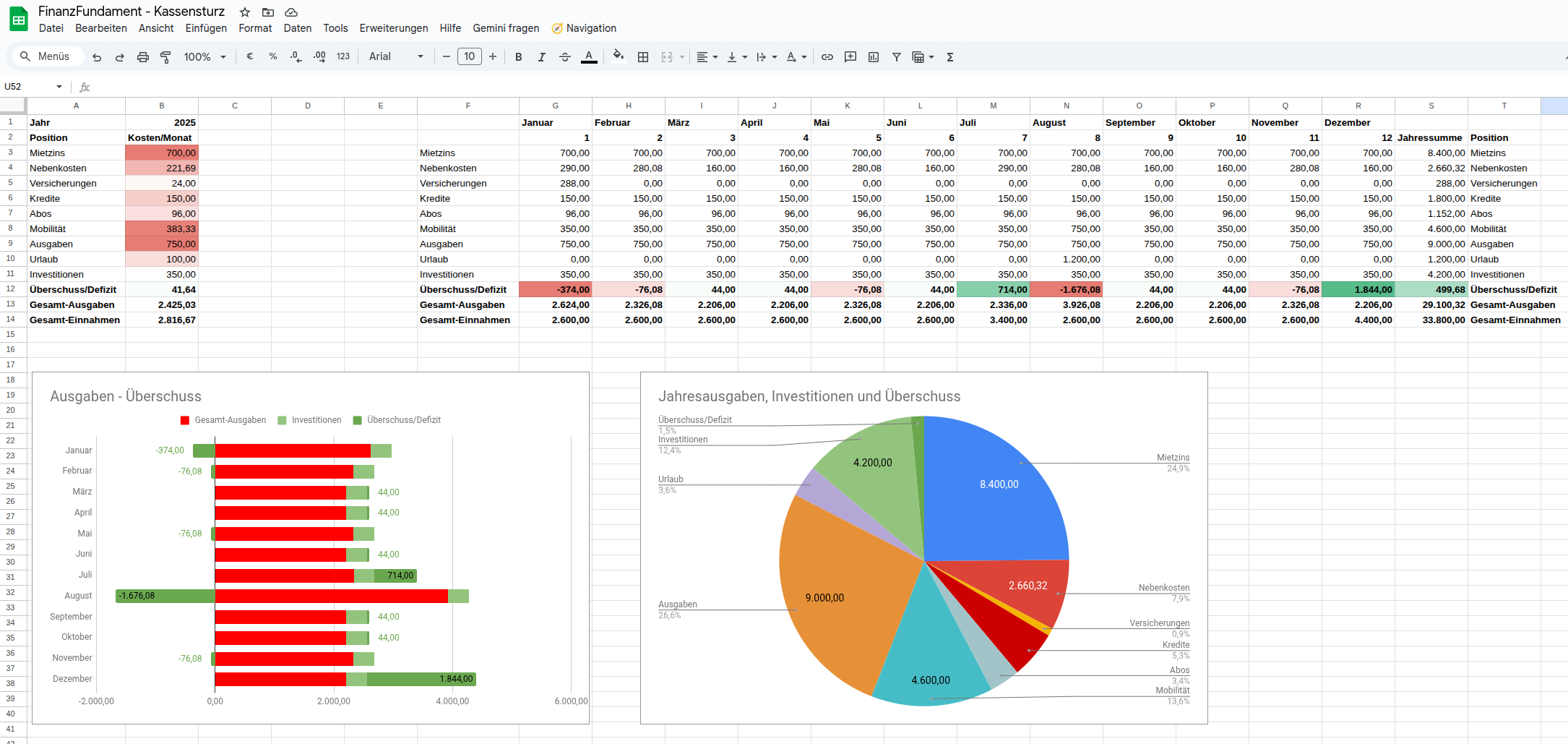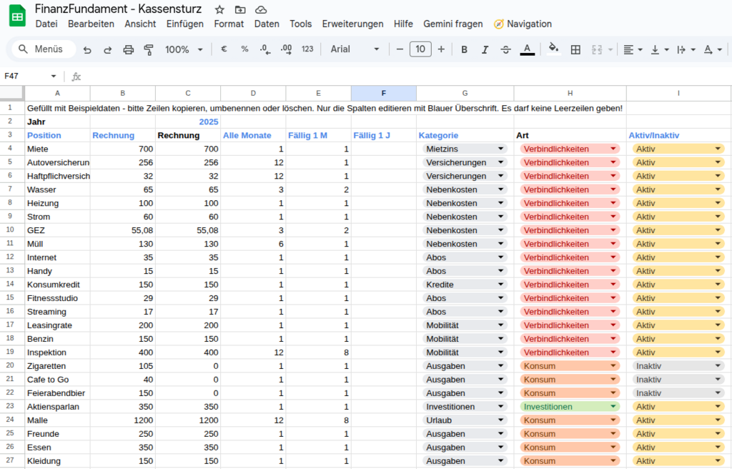 - Fixkosten (Miete, Strom, Versicherungen, Auto, Abos)