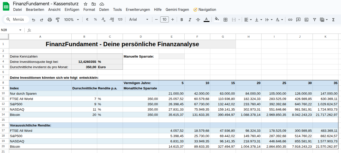 Damit du dir leichter einen Überblick über deine finanzielle Situation verschaffen kannst, habe ich ein Google-Sheet mit Beispieldaten entworfen, in dem du deine Einnahmen und Ausgaben einpflegen kannst. Es werden Diagramme erstellt und Investitionsmöglichkeiten und mögliche Ziele aufgezeigt. Eine genaue Beschreibung und einen kostenlosen Download findest du in diesem Beitrag.