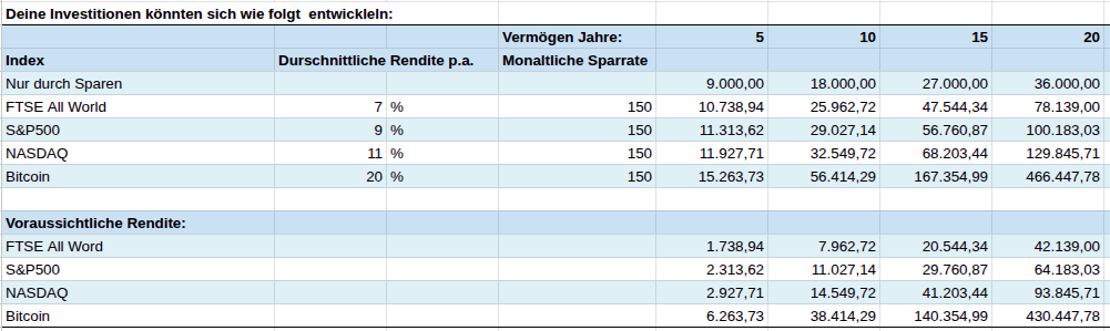 Angenommen du investierst monatlich nur 150 € mit 7 % Rendite über 20 Jahre. So hast über über die Jahre 36.000 Euro eigenes Kapital eingebracht, der Endbetrag beträgt jedoch über 78.000 Euro. Mehr als die Hälfte, also 42.000 Euro kommen durch Zins und Zinseszins hinzu. Kommen diese 150 Euro noch aus einer unachtsamen Ausgabe wie z.B. Zigaretten, so hast du nicht nur einen positiven Effekt für deine Gesundheit erzielt, sondern gleichzeitig Vermögen aufgebaut.