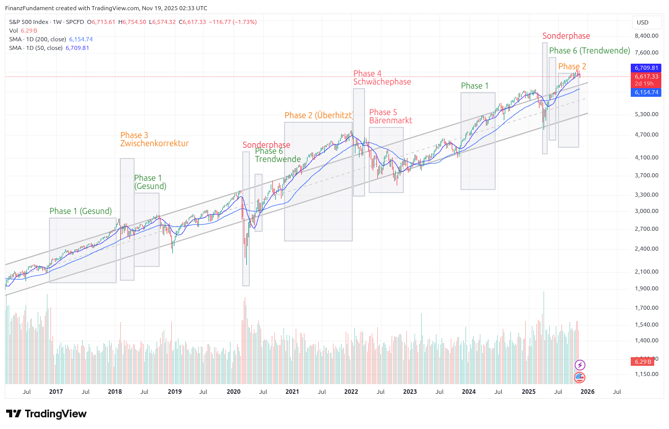 Über die Jahre habe ich ein automatisiertes Auswertungssystem entwickelt, das die zentralen Marktindikatoren objektiv misst, bewertet und damit alle Emotionen eliminiert. Es ordnet darüber hinaus den S&P 500 in sechs Trendphasen und eine Sonderphase ein, die für antizyklische Chancen steht. Jede Phase erhält ein eindeutiges Symbol, das du im wöchentlichen Marktkompass jeden Sonntag sofort wiedererkennst.